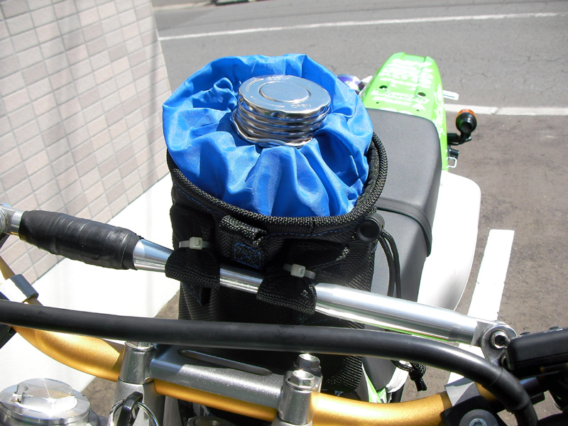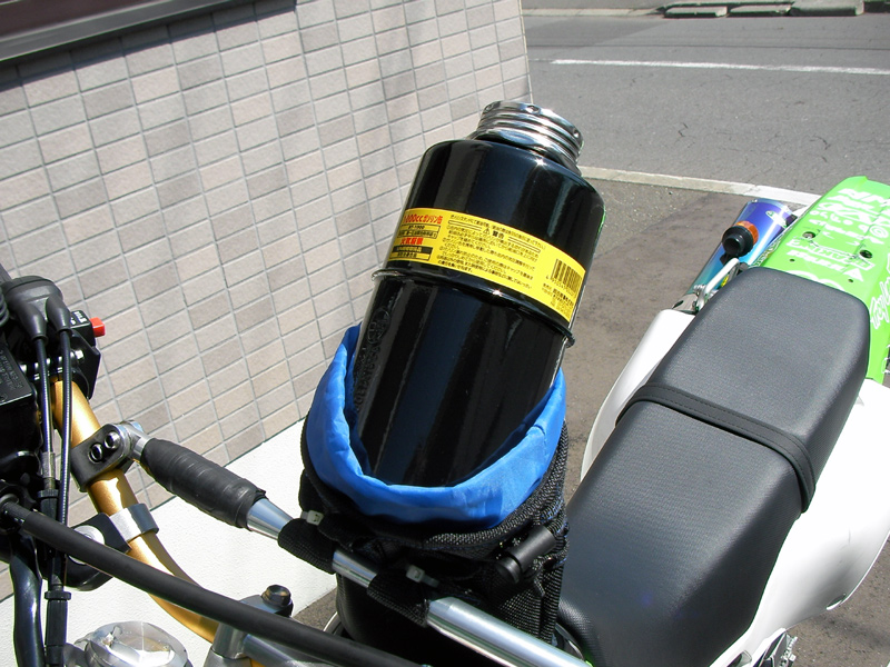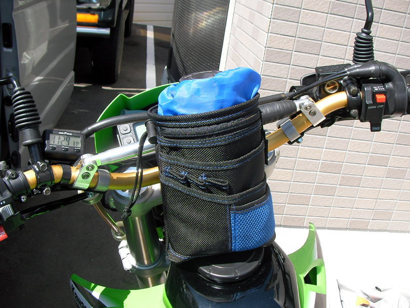 そこで、ホームセンターで買ったチョークバックもどきをハンドルバーに固定してみました。