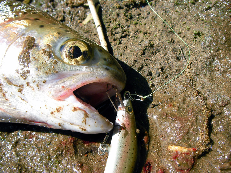 今度は40upのニジマスが底から浮いてきてアタックして反転するのが見えました。