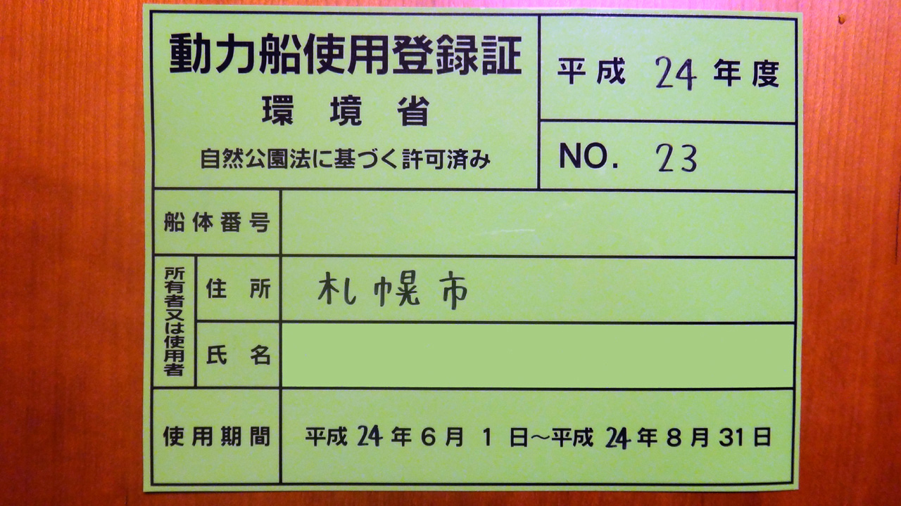 そうそう、平成24年度支笏湖動力船使用登録証が今日届いてました。